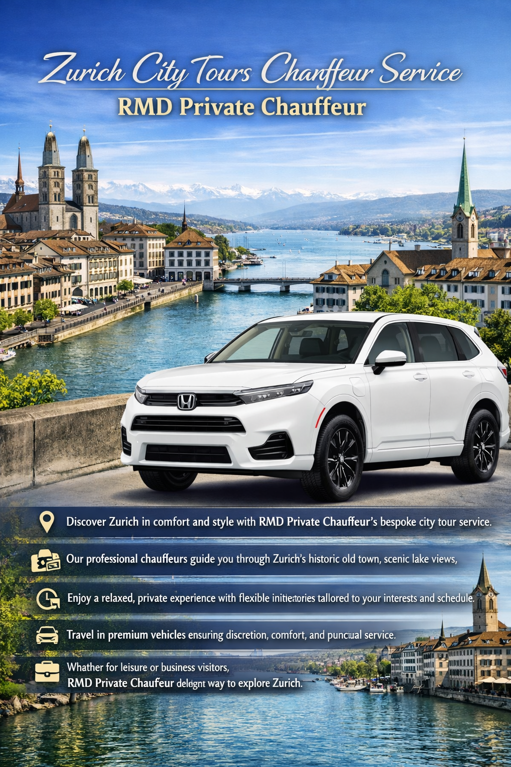 Discover Zurich in comfort and style with RMD Private Chauffeur’s bespoke city tour service. Our professional chauffeurs guide you through Zurich’s historic old town, scenic lake views, and vibrant districts. Enjoy a relaxed, private experience with flexible itineraries tailored to your interests and schedule. Travel in premium vehicles that ensure discretion, comfort, and punctual service throughout your tour. Whether for leisure or business visitors, RMD Private Chauffeur delivers an elegant way to explore Zurich.